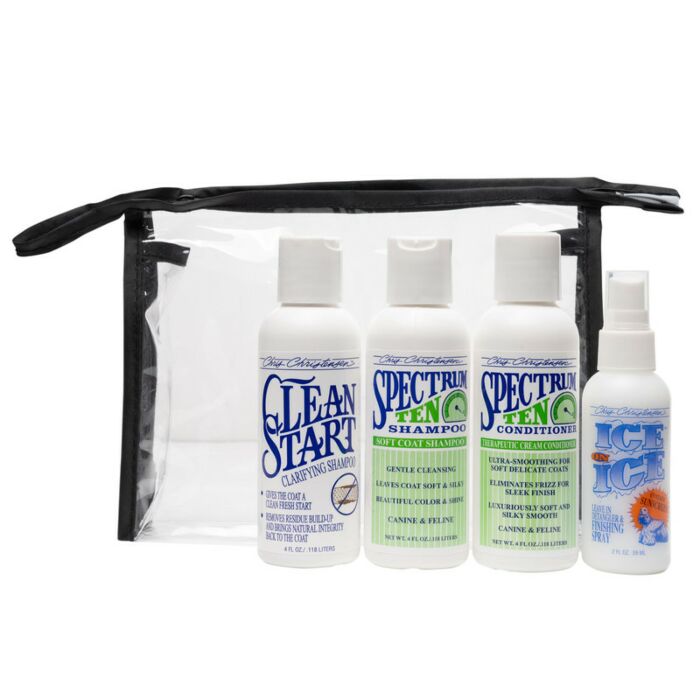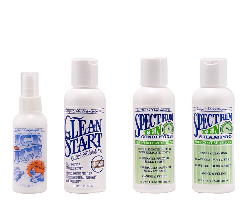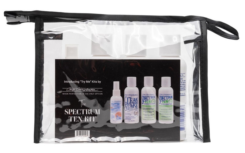 The Chris Christensen Spectrum Ten Try Me Kit is the perfect way to try products developed especially for drop coats and smooth coat types. This convenient kits includes four of Chris Christensen's most popular product designed to create noticeable smoothness, shine and manageability in just one use.