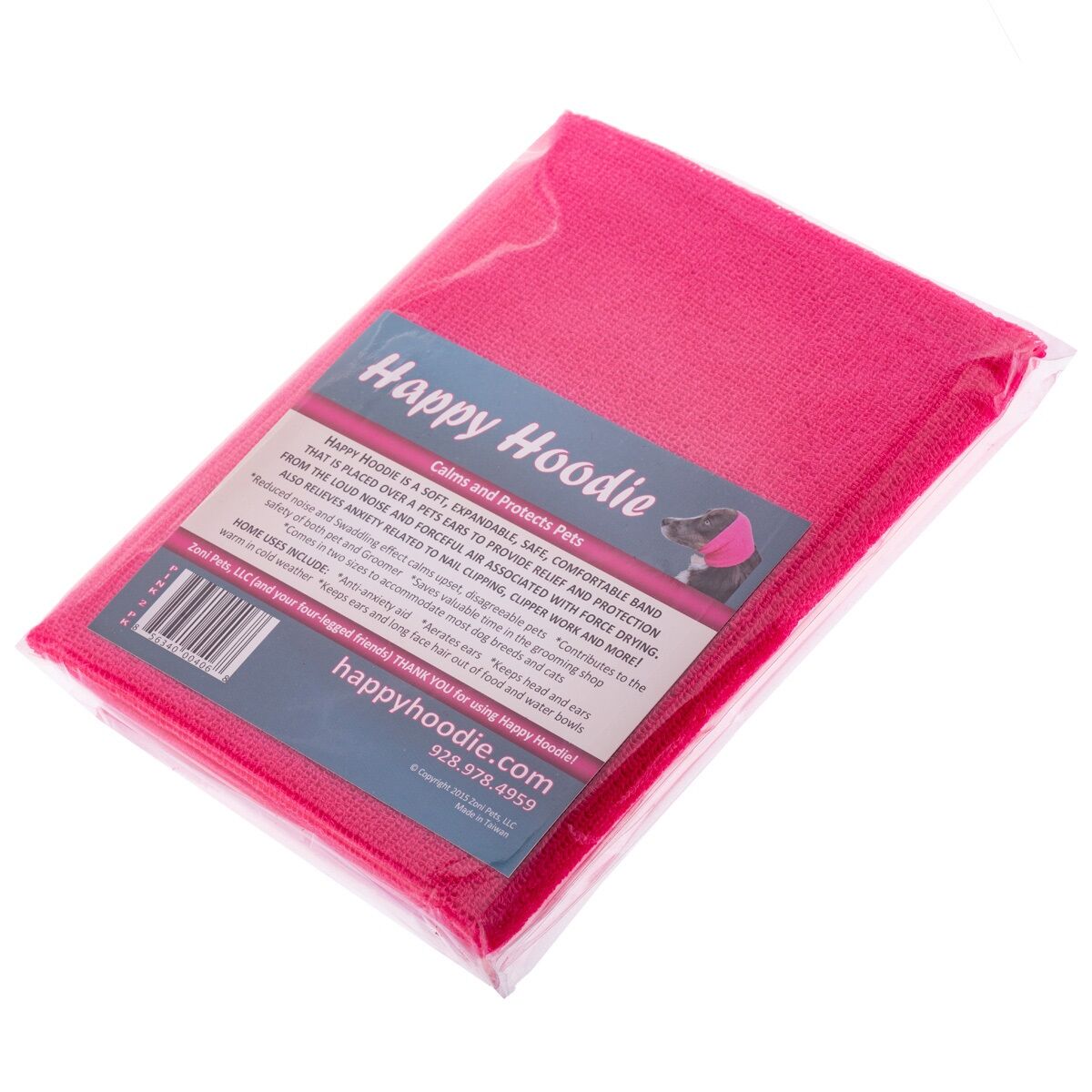 Some dogs become anxious or fearful because of the air noise and wind force associated with high-velocity dryers. The Happy Hoodie muffles the noise and calms the pet. The thick terry material helps soak up moisture from the covered area assisting the drying of ears and face. Simply place the Happy Hoodie over the pet's head onto its neck. Place the ears against the pet's head so air cannot get into them and slide the band back over the top of the head to secure the ears in place. Adjust the width of the band to best fit the pet by folding over excess material once the band is on. Remove the Happy Hoodie to dry the remainder of the head, ears, and face.