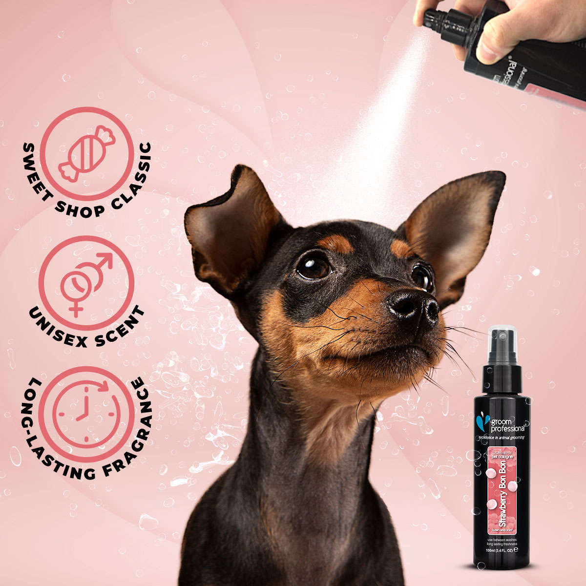 Enhance the sweet experience by pairing Strawberry Bon Bon Dog Cologne with Groom Professional Berry Blast Shampoo for a complete and refreshing grooming routine.