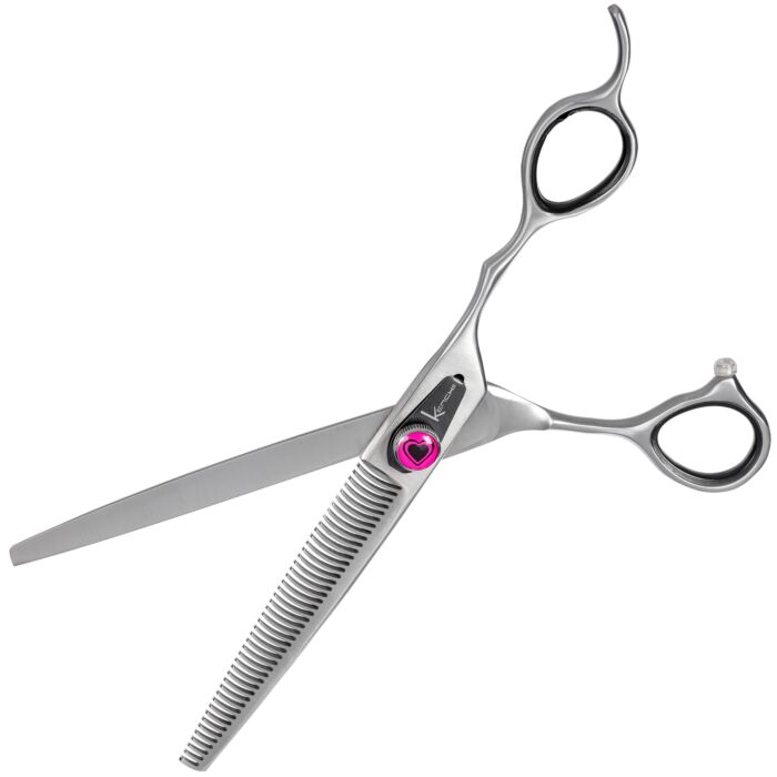 Kenchii Love Straight Scissors Range features Japanese alloy steel, Custom non-slip micro-serrated edge, Fully forged, hand-honed blades and an offset handle. Perfect for entry level groomers.
