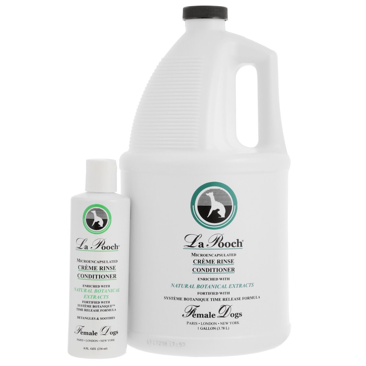 Les pooch shampoos are considered by top breeders and styling professionals to be the finest in the world. From show shampoos and crème rinses to the hypo-allergenic and medicated line, Les Poochs use only the finest ingredients delivering the very best finish to both coat and skin.La Pooch Crème Rinse Conditioner is a unique female scented conditioner with unique properties. A luxurious formula which combines state-of-the-art time-release technology with ancient botanical extract therapy. Les Poochs crème rinses feature natural botanical extracts of Royal Jelly, Sea Kelp, Evening Primrose, Apricot and Swiss Chamomile, which have been used in Europe for centuries to soothe and heal skin ailments. Silk Protein and Pro-Vitamin B5 help improve manageability, sheen and texture. Excellent for long haired breeds, and dogs with matted, dry, dull or lifeless coats.