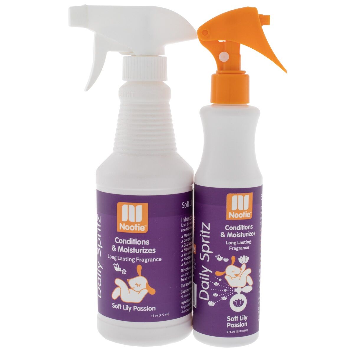 The soft delightful flora scent of our Soft Lily Passion long-lasting fragrance will keep your dog smelling fresh and clean between baths while conditioning the skin and coat. Nootie’s Daily Spritz is made with natural ingredients and is soap and paraben-free. It’s long-lasting. and made with a gentle, conditioning formula that contains no sulfates or harsh chemicals. Gentle enough for everyday use! Find your favourite scent today!