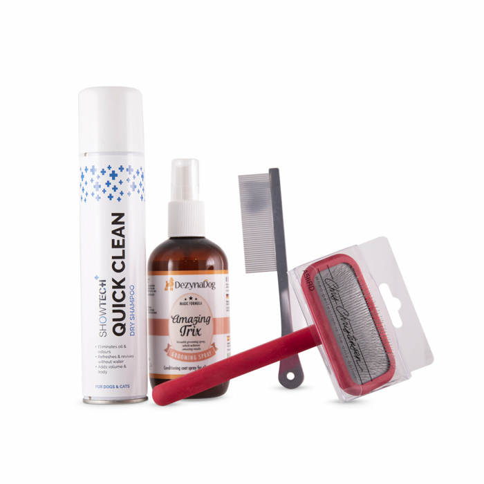 Maybe you arrive at a dog show after a long journey and your dog gets dirty on the way to the ring! Sometimes a full bath is not possible, now with Show Tech+ Quick Clean it’s easy to clean your pet’s coat on-the-go!