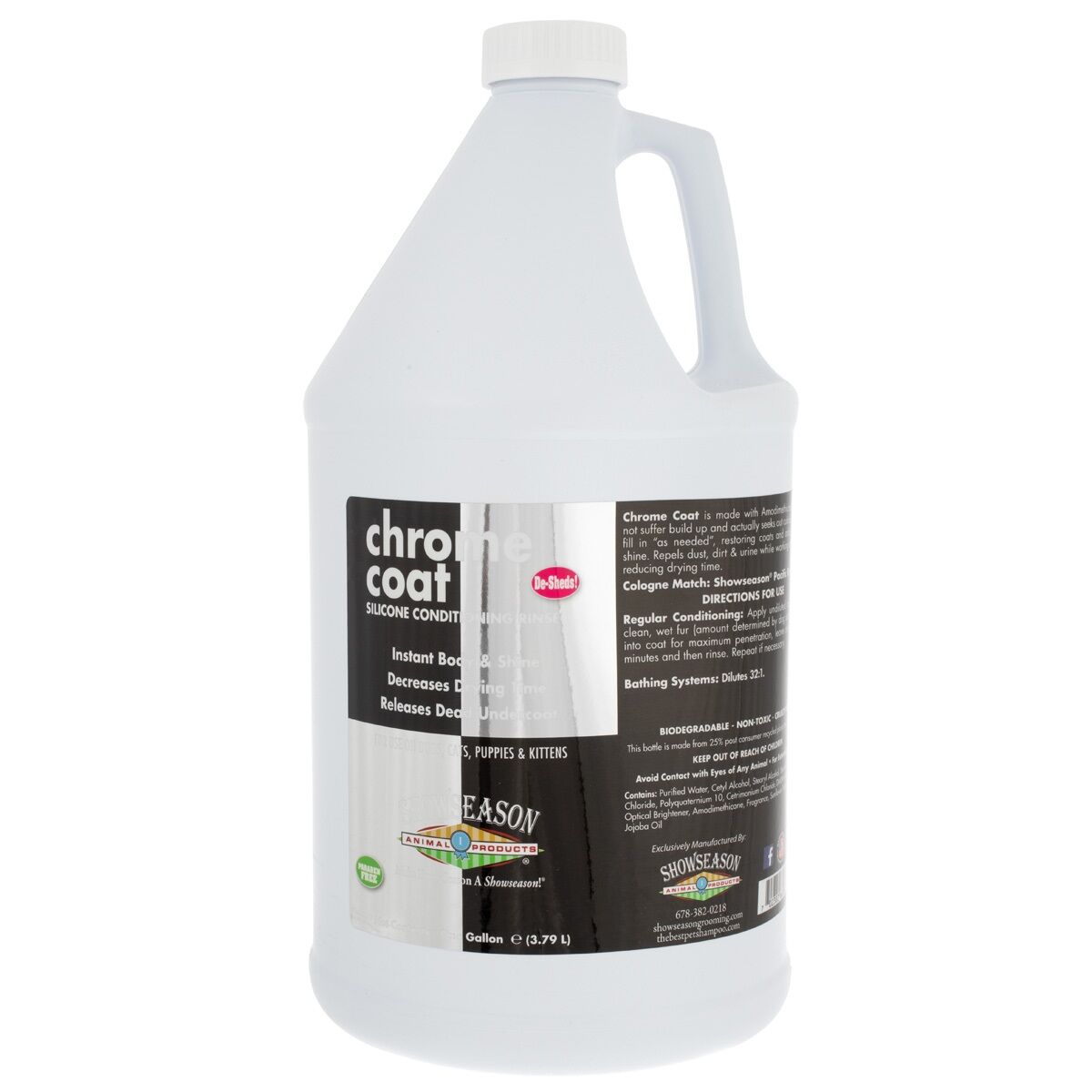 Fantastic conditioning rinse that's made with modern silicones that do not cause build up and actually seeks out damage on the hair cuticle to fill in "as needed" making coats soft and shiny. Drying time and static are reduced significantly on double coated breeds when using Chrome Coat as a final rinse or spray. Can be diluted up to 16:1. Can also be made into a finishing spray when diluted 32:1.Brand | ShowSeason |