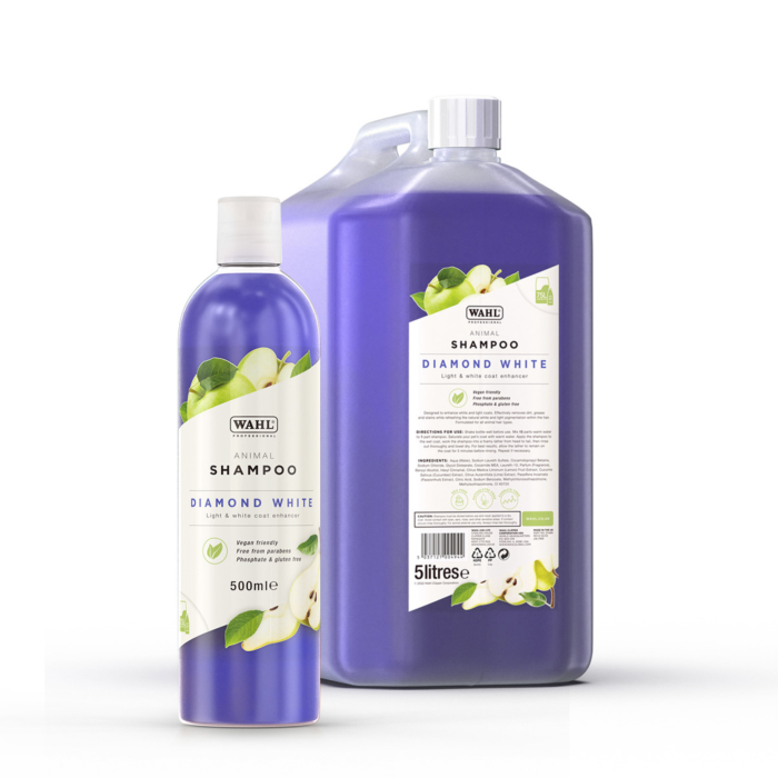 Full of natural goodness, Wahl Diamond White Shampoo contains extracts of cucumber, passion-flower, lemon and lime to help with the cleaning and brightening process. And, thanks to the blend of natural ingredients, this sweet, apple-scented shampoo will have the coat smelling just as good as it looks!